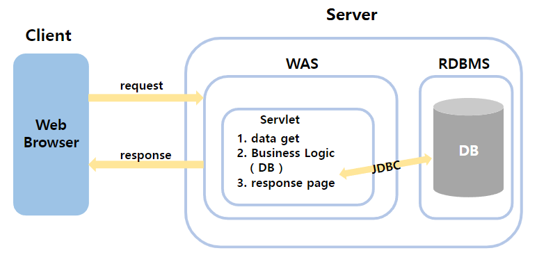 JSP와 비슷하지만 JSP는 HTML 문서 안에 Java코드를 포함하는 반면, 서블릿은 자바코드안에 HTML을 포함하고 있다는 점에서 차이점이 있다.