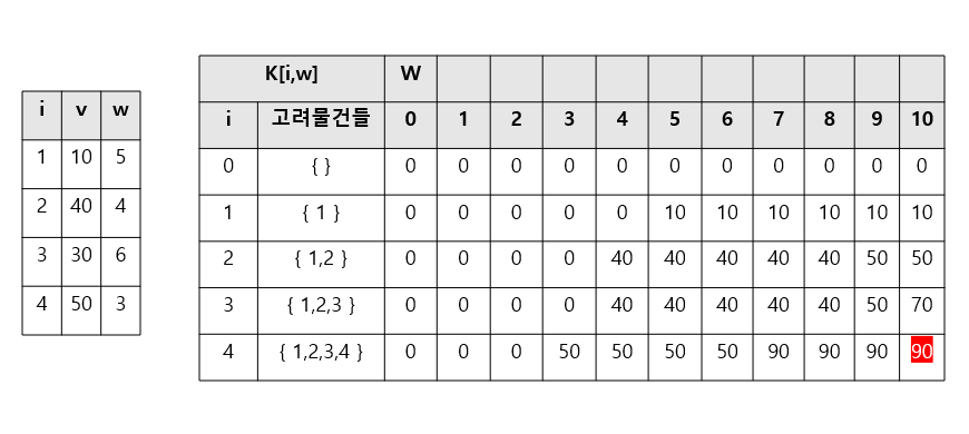 - K[i,w] : 물건 1~i까지만 고려하고, (임시)배낭의 용량이 w일때의 최대가치