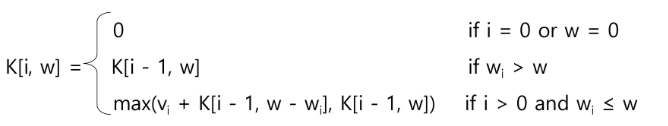 - 최적해는 물건 i를 포함한다 => 물건i의 가치 + 배낭용량이(w-wi)인경우의 가치 (내가 들어갈 공간을 제외한 배낭의 최대가치)
