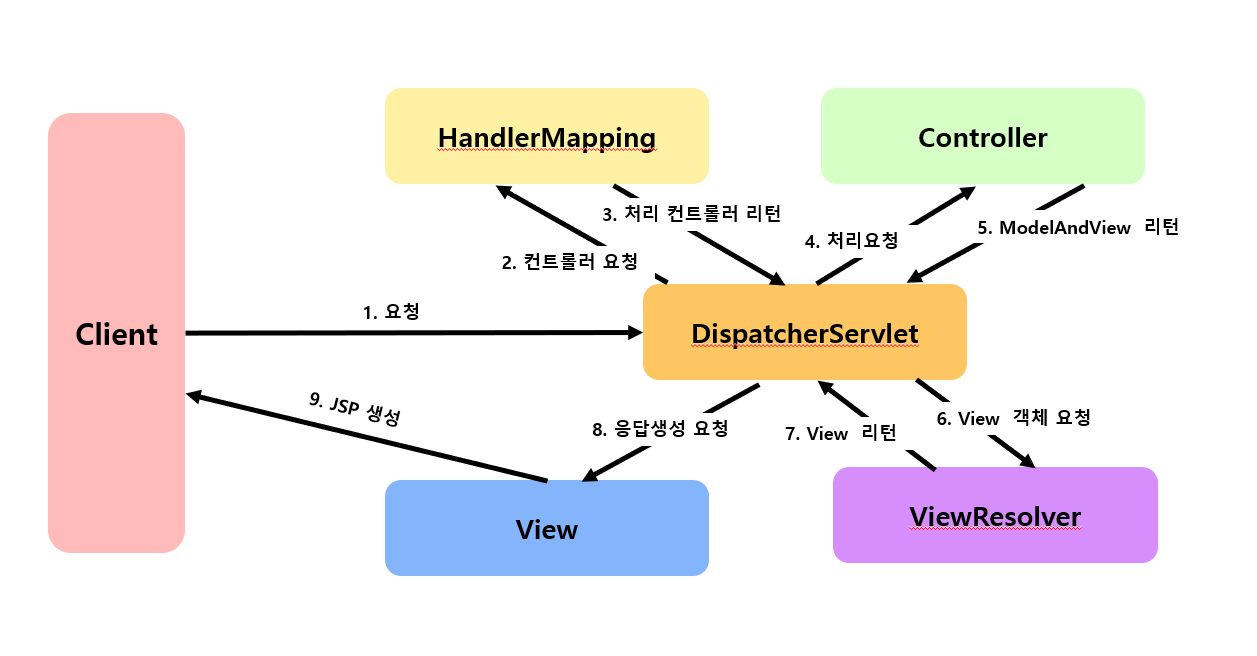 | ViewResolver | Controller가 리턴한 뷰 이름을 기반으로 Controller의 처리 결과를 보여줄 View를 결정 |
