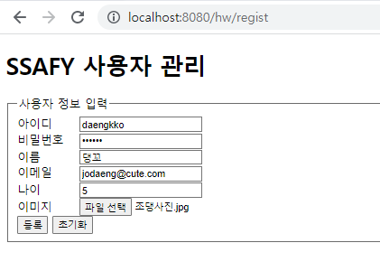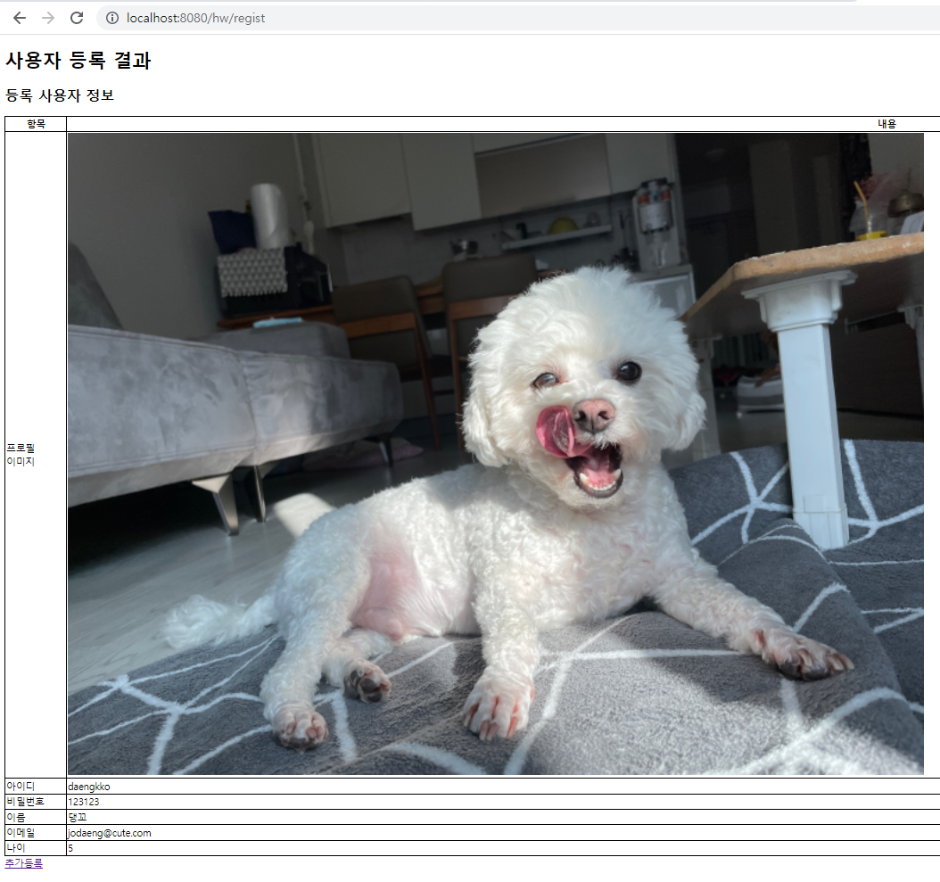 - regist_result.jsp에서 사용자 등록 시 이미지를 등록하였다면 결과화면에 같이 보여주도록 작성