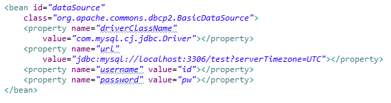 - 데이터소스는 dataSource아이디를 가진 빈으로 데이터베이스 연결정보를 가진 객체