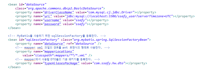 - root-context.xml에 빈 등록 (DataSource, SqlSessionFactory, Mapper, Dto)과 namespace선언