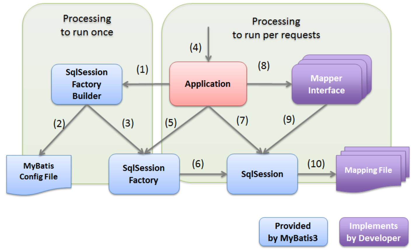 | SqlSession | 핵심적인 역할을 하는 class로 SQL실행이나 Transaction관리를 실행 SqlSession오브젝트는 Thread-Safe하지 않으므로 thread마다 필요에 따라 생성 |